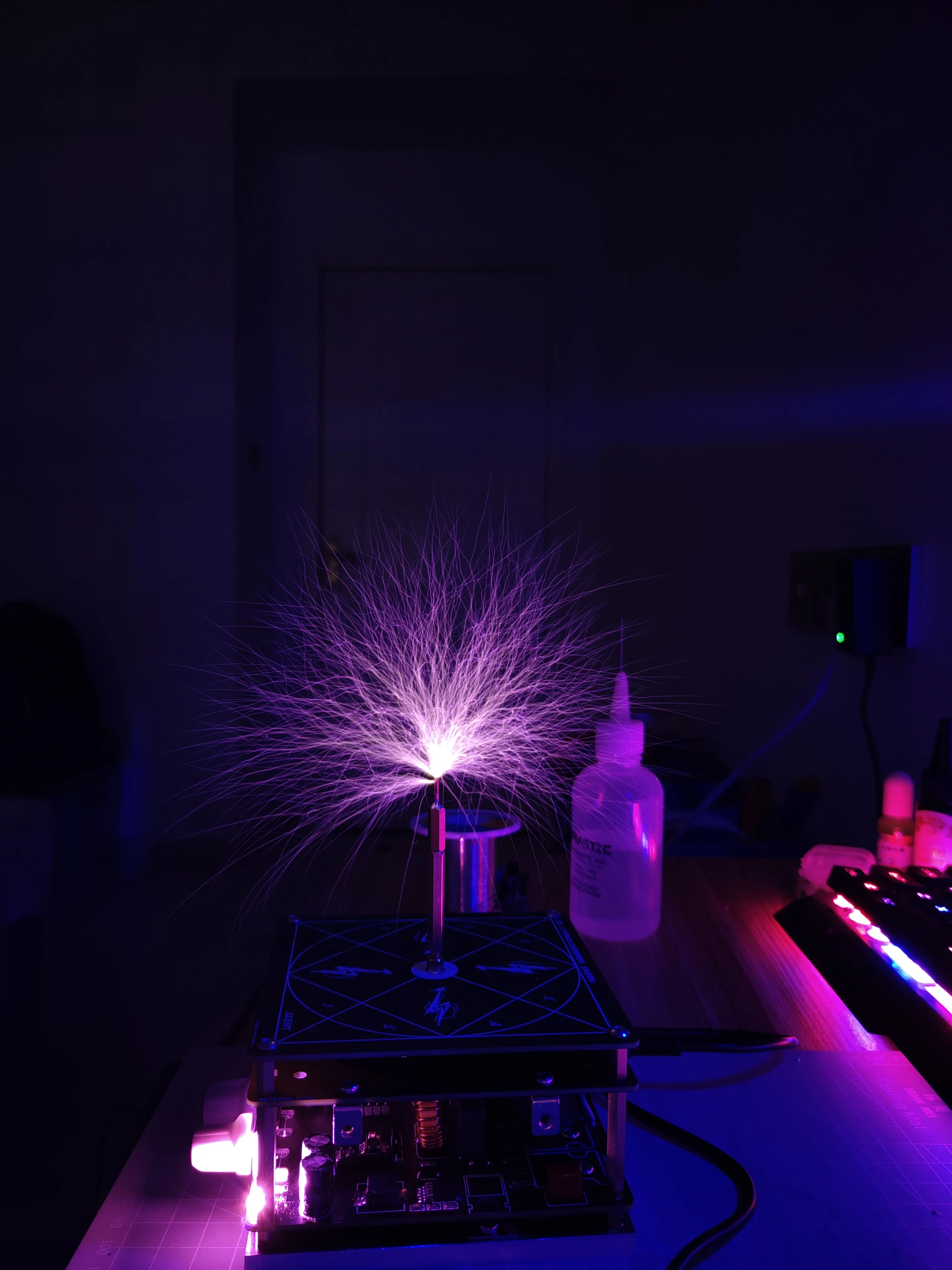 The Tesla coil is only powered by 52V DC. The low-voltage power supply ensures safety, and the effect is comparable to that of the desktop electric half-bridge Tesla coil.